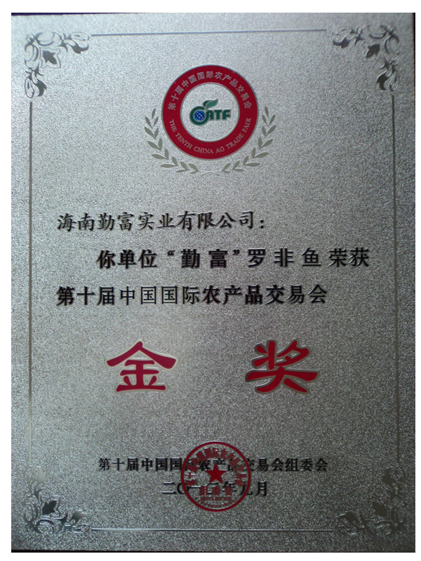 我司“勤富”羅非魚片于2012年9月參加第十屆中國國際農(nóng)產(chǎn)品交易會,榮獲第十屆中國國際農(nóng)產(chǎn)品交易會金獎,為推動農(nóng)業(yè)企業(yè)和產(chǎn)品的品牌建設(shè),促進農(nóng)產(chǎn)品質(zhì)量的不斷提高和優(yōu)質(zhì)農(nóng)產(chǎn)品的生產(chǎn),向社會及消費者推薦優(yōu)質(zhì)農(nóng)產(chǎn)品,促進貿(mào)易打下堅實基礎(chǔ)。