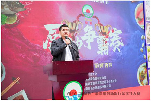 周云峰總經(jīng)理做了熱情洋溢的致辭,他首先感謝文昌市總工會對我們“勤富杯”翡翠鯛創(chuàng)新流行菜烹飪大賽的大力支持,說明了舉辦“勤富杯”翡翠鯛創(chuàng)新流行菜烹飪大賽的意義,最后,他說公司決定把翡翠海南鯛作為我們當(dāng)下開拓國內(nèi)市場的爆品,以此作為新的發(fā)展突破口,并且要上升為公司戰(zhàn)略,要在國家“雙循環(huán)”、建立統(tǒng)一大市場的發(fā)展格局下,全產(chǎn)業(yè)鏈打造翡翠海南鯛,舉旗揮師進軍占領(lǐng)國內(nèi)市場。