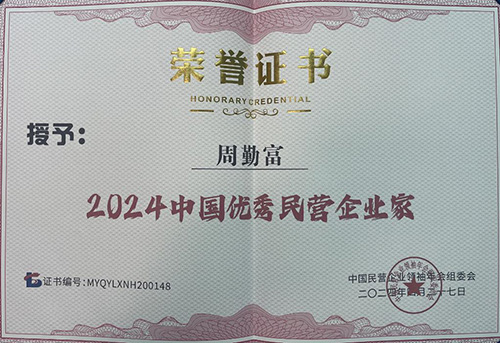 由中國國際經濟合作學會產業經濟工作委員會、環球精英雜志社、北京藍源民族產業研究院共同主辦的第七屆中國民營企業領袖年會暨 2024金融創新助力實體經濟高質量發展論壇于 2024年4月26—27日在北京隆重召開。我司周勤富董事長應邀參加本次年會。我司在本次大會上榮獲“2024中國優秀民營企業”稱號,周勤富董事長榮獲“2024中國優秀民營企業家”稱號。